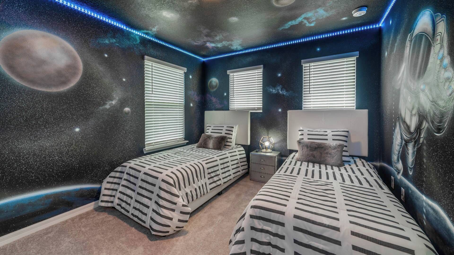 When it’s time to rest up for a day of Orlando fun, every bedroom in this home is a great place to get a good night’s sleep. Guests can pick and choose from two king bedrooms, a full bedroom or two twin bed options that are ideal for little ones! Adding to the fun is the fact that one of the twin bedrooms is fully space themed while the other features Disney princesses! Each bedroom has its own private bath as an added convenience.