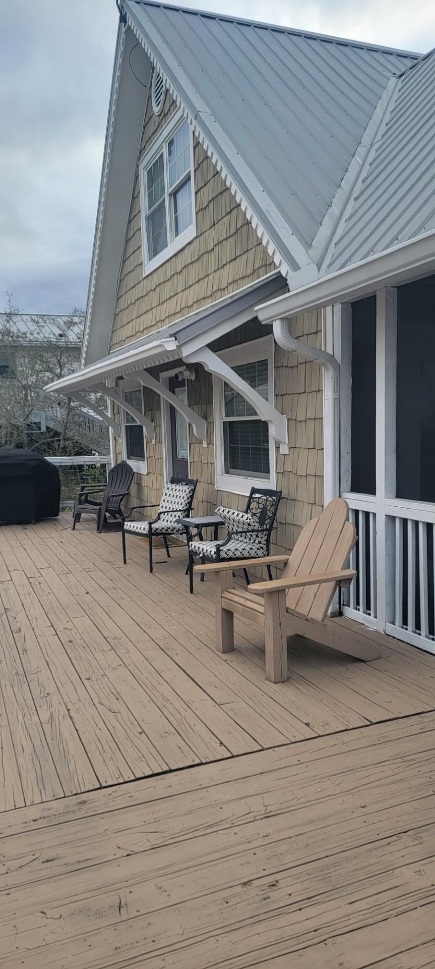 We really enjoyed our stay. I was a bit off put when we arrived and the yard and under the carport area were very messy. First impression was not a good one. The outside of the house and lawn need maintenance. The inside of the house was fine. The beds were comfortable, clean, and there were plenty of towels, etc. The location was great for us as we are older and not as mobile as we used to be. We loved the outside area and spent most of our time on the porch and upper deck. There is plenty of space to spread out and have some alone time. We would definitely stay her again.