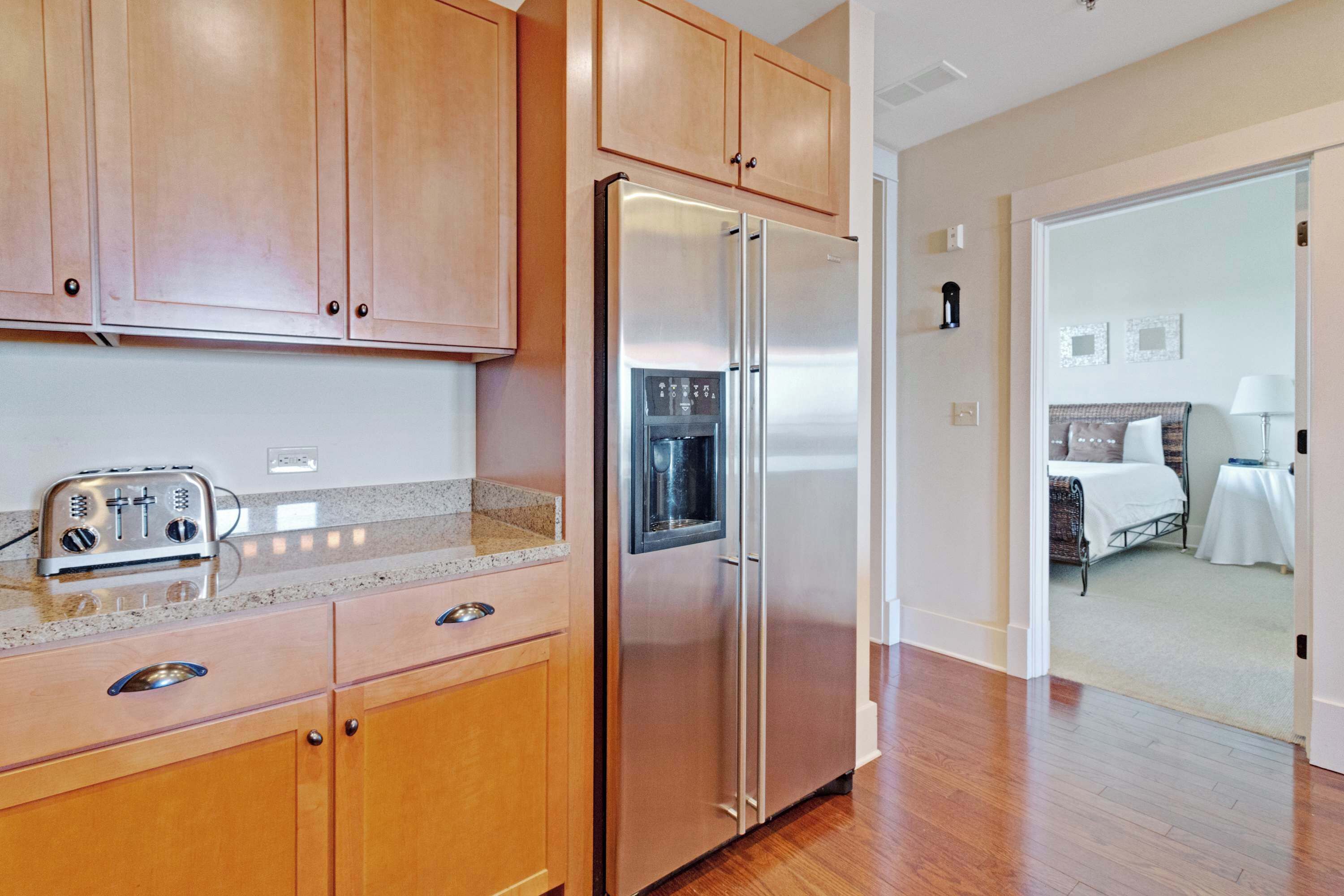 Your whole family with find comfort in the well-appointed bedrooms with sleeping space for up to 6 guests. The master bedroom with king bed enjoys an en suite bath with walk-in shower and dual shower heads. The guest bedroom's seersucker patterned queen bed and built-in bunk punch up the fun in this family suite.