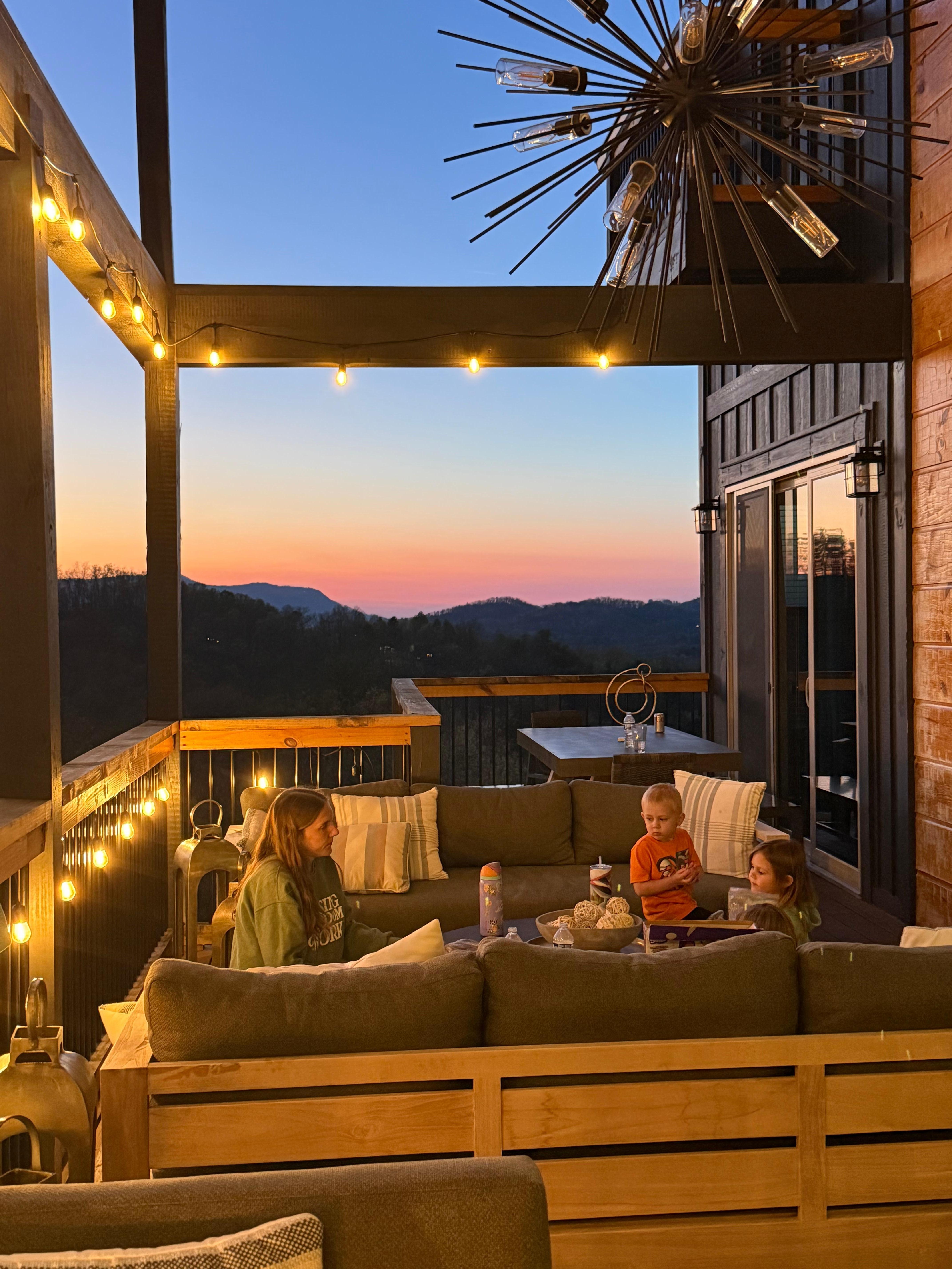The outdoor entertaining spaces also set this luxury cabin apart, with TWO LEVELS of COVERED DECKS spanning the entirety of the back of the cabin. These decks are true INDOOR/OUTDOOR LIVING SPACES with high end furniture, rugs, overhead lighting, gas grill, bar seating area, and a large fire table. Whether you're grillin' and chillin', or sittin' and sippin' at the outdoor table drinking coffee or other good stuff, you will enjoy the panoramic views and fresh mountain air in either rain or sunshine.