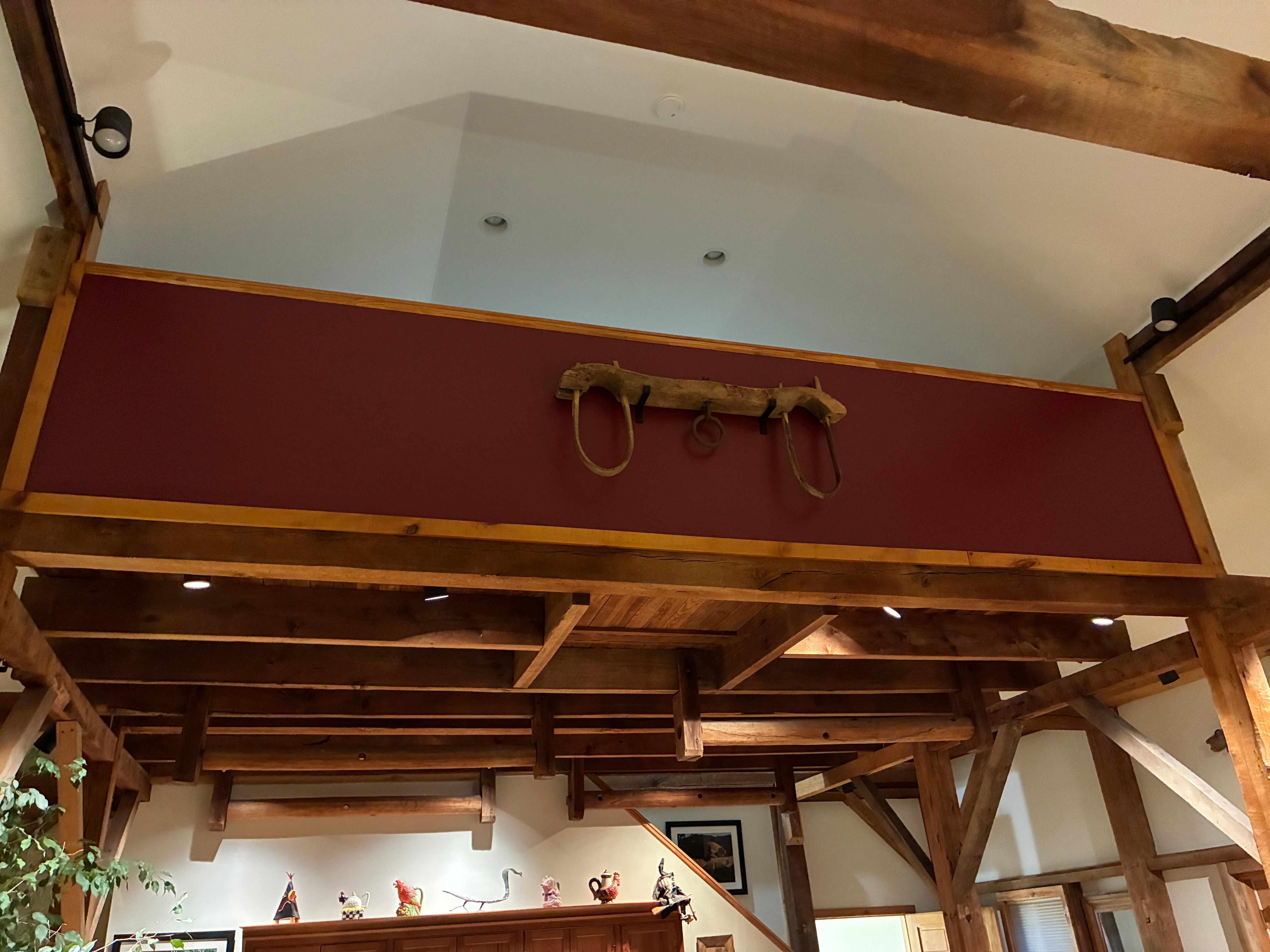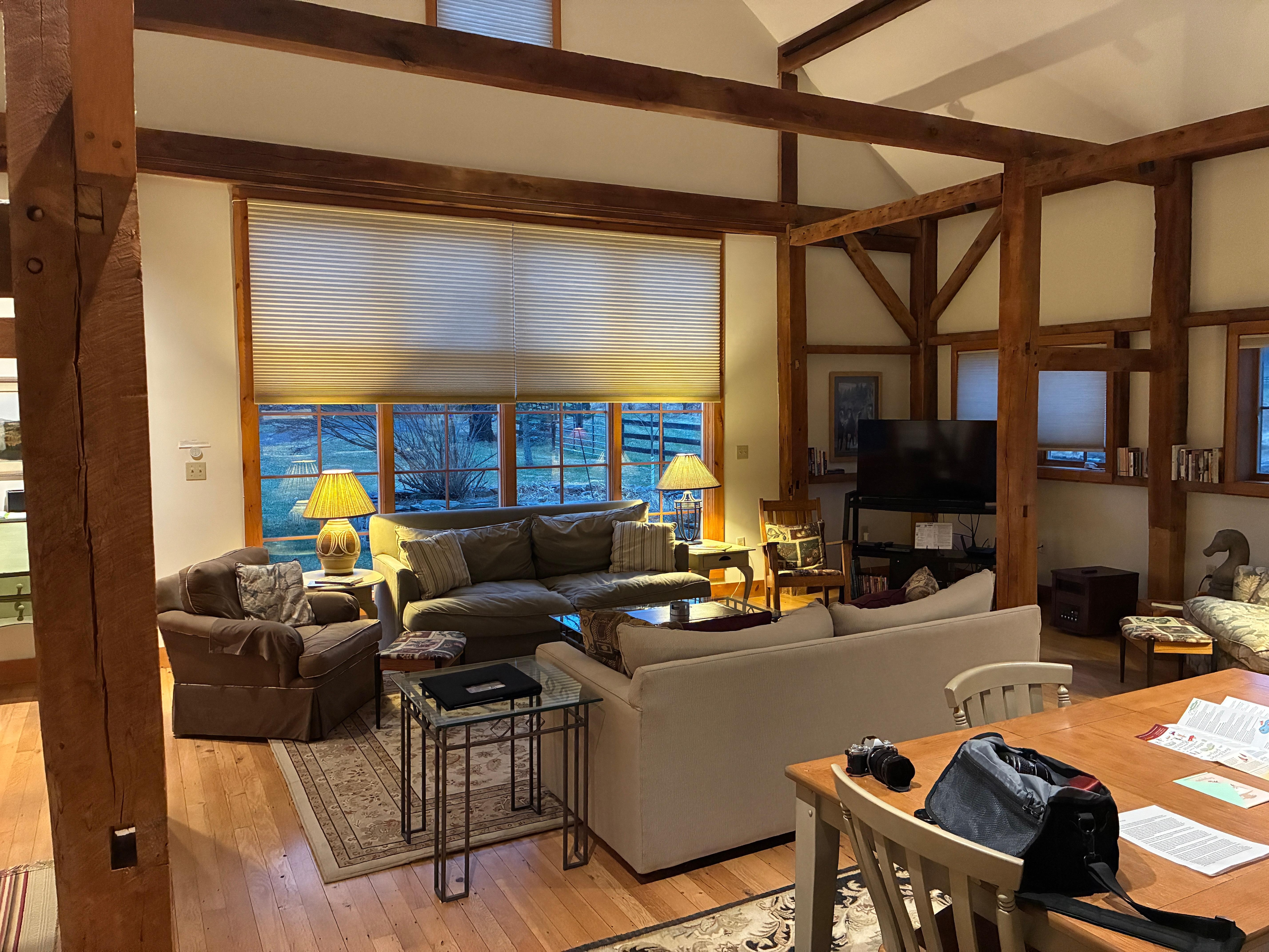 Great post and beam interior on a horse and cattle farm with a beautiful setting.