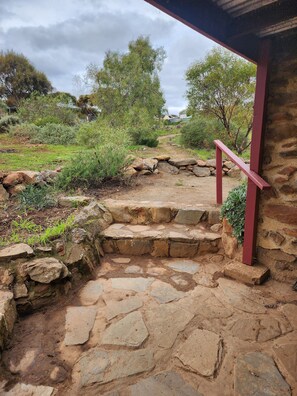 Front door entry leads into the main room, a cosy living/dining area, containing a combustion wood fire. With vaulted pine ceiling, slate floor and mud brick walls, a lovely warm space greets you. The kitchenette is very well equipped with eating space for two, basic pantry staples (oils, herbs/spices, tea/coffee, milk) kitchenware and cooking equipment (toaster, kettle, espresso machine, frypans, saucepans, electric grill and frypan and slow cooker. Included in your stay are cooked breakfast provisions sufficient (at least) for your first morning - homemade bread and jam, juice, home grown eggs, sausages, bacon, tomatoes, mushrooms and baked beans. Either a regular or vegetarian option can be requested. There is also a WeberQ located on the front verandah.