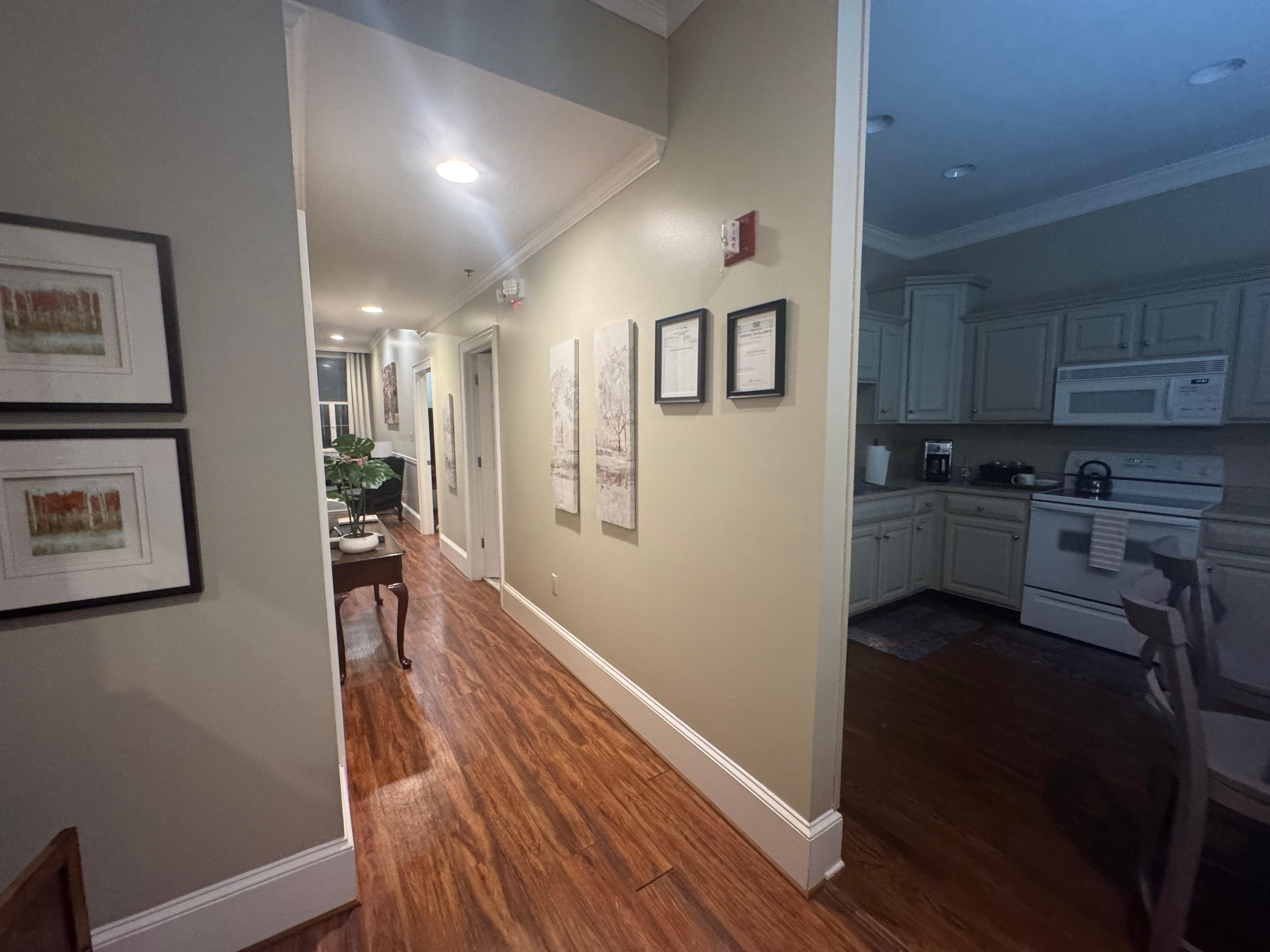 When staying at the Oglethorpe Lodge, you can expect a comfortable room with plenty of space and amenities. The suite includes a full kitchen and living space for visiting with friends and family. Extra sleeping space is included with a pullout sofa in the room. Suite 3 has a designated off-street parking space located behind the lodge.