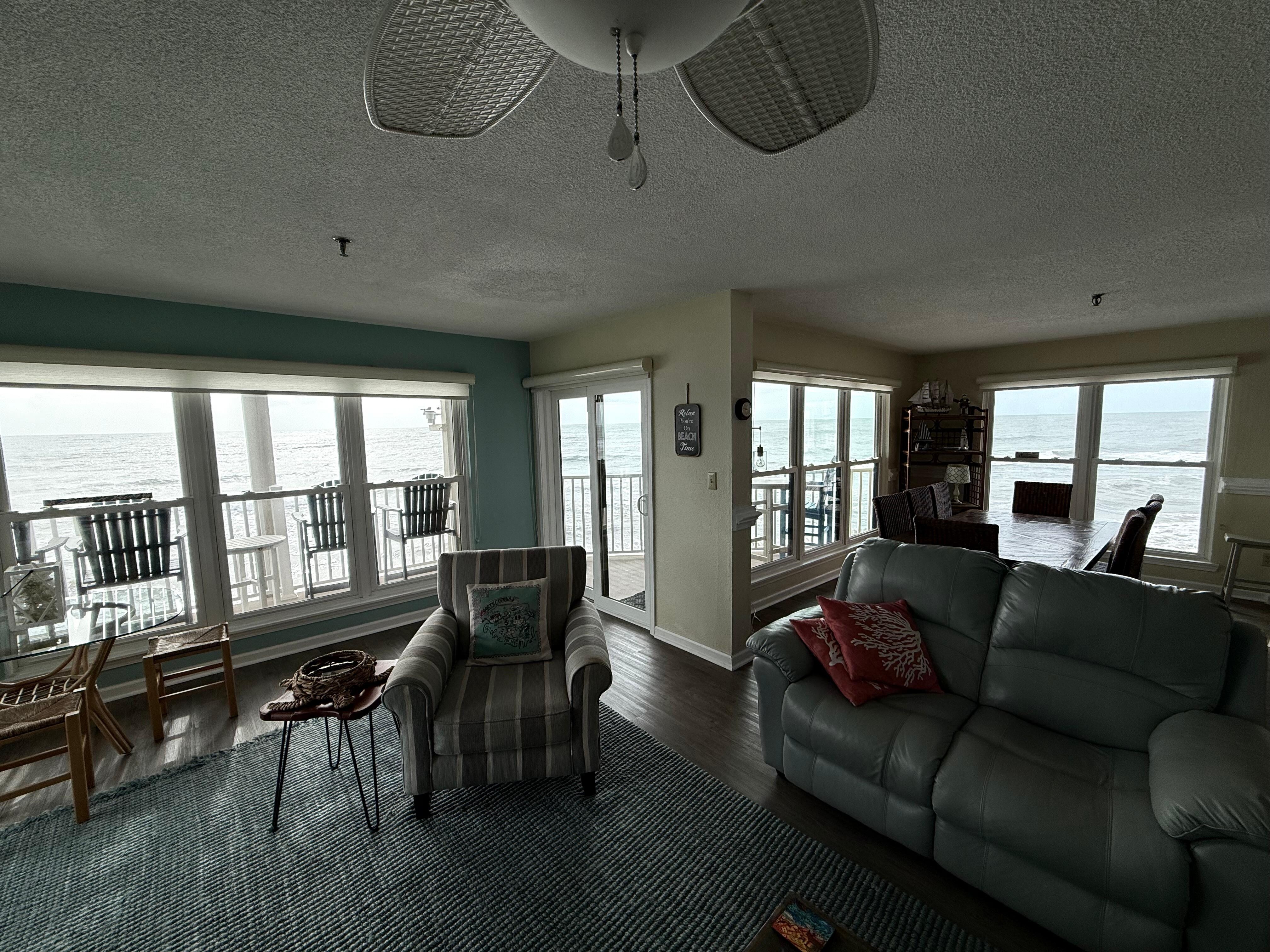 Tucked into the dunes on the quiet north end of Topsail Island, Topsail Dunes offers guests a large in-ground pool, a family recreation area with a playground, grills, and dedicated beach access. This gorgeous, family-friendly condo provides guests with a beachfront escape and unparalleled views of the beach and the ocean from the large living and dining areas. Spend your days soaking up the sun and watching the boat traffic on the Intracoastal on your private balcony, conveniently furnished with enough tables and chairs. The carpeted living area features inviting sofas, chairs, board games for the entire family, dozens of books, a TV, and a wet bar in the corner. Show off your cooking skills in the well-equipped kitchen with tiled floors, all major appliances, including a dishwasher, and a breakfast bar.