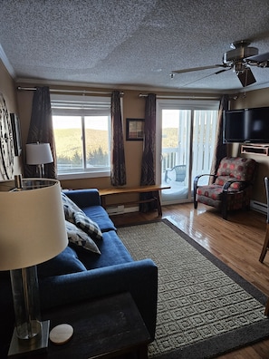 The living room has a sleeper sofa and recliner with a wall mounted tv and mountain views. A portable A/C unit is available in the summer.
