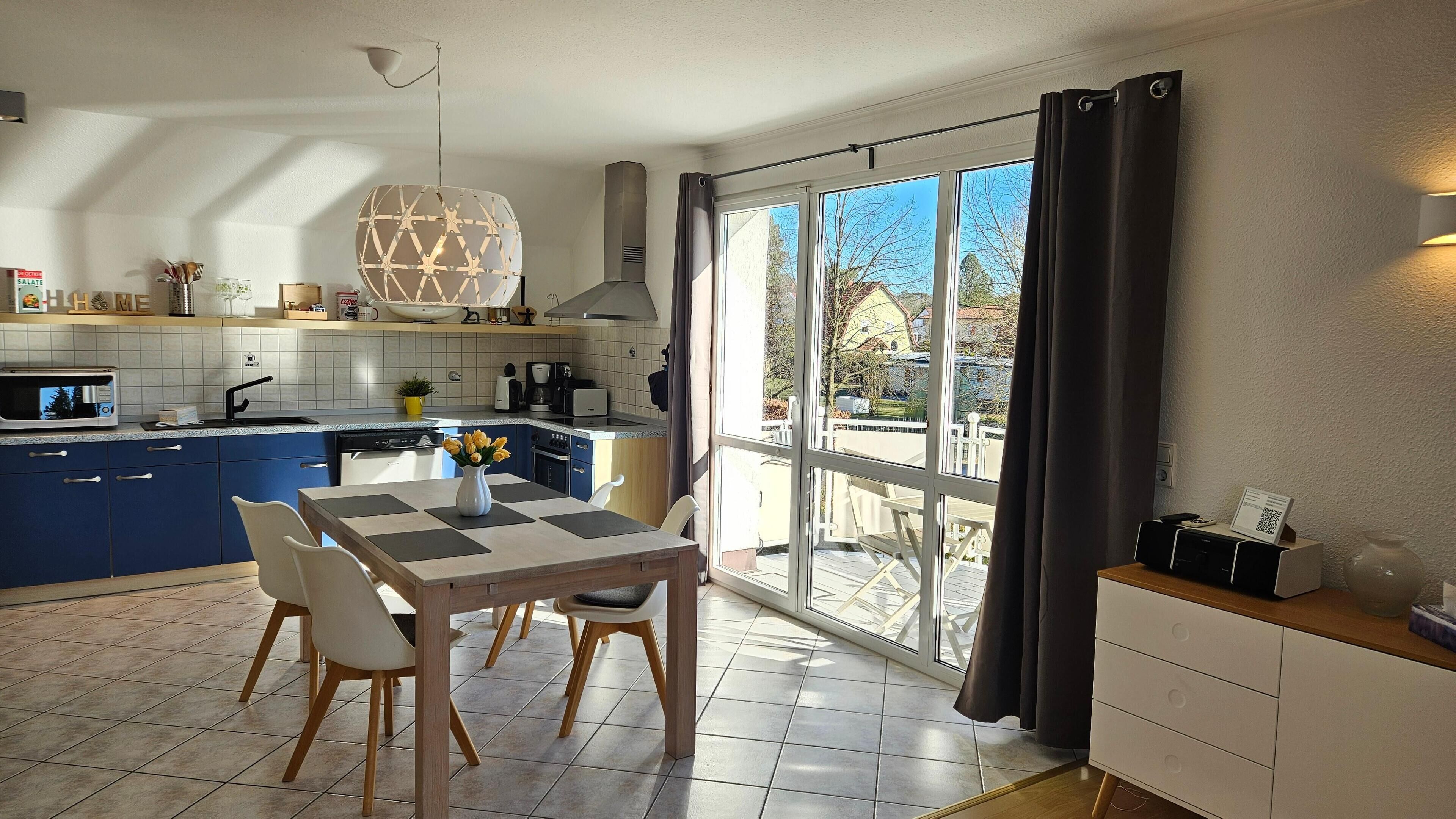 The apartment offers a kitchen, a washing machine and a balcony