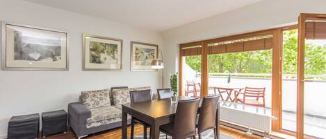It is a premium flat with a well-equipped kitchenette and a modern bathroom with a total area of 29 m2, as well as a balcony. It is a unique interior that combines classic and modern. It is dominated by light colours from the white and grey palette and light wood, which gives the room a noble character and slightly warms it. An additional advantage is the white brick wall, which represents the essence of simplicity and minimalism in the flat. The whole thing is rounded off with comfortable, tasteful furniture and numerous golden accents that visually enlarge the space and give it a unique extra dimension. It's a comfortable place for people who want to feel at home next to the seaside attractions: spend some time in an incredibly comfortable bed, watch TV, listen to a good audiobook or read a favourite book.