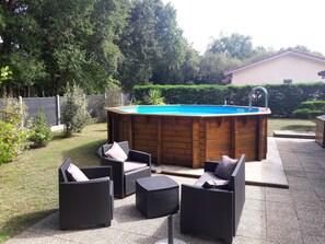 Thanks to its large plot of 1200 m², its above-ground wooden swimming pool and its three terraces, one of which is covered, you can enjoy the outdoors in the shade as well as in the sun.